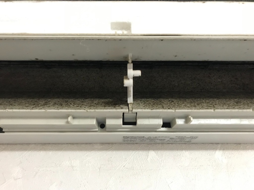 エアコンの内部には湿気が溜まりやすく、季節によってはあっという間にカビの温床となってしまうこともあります。こちらは定期的にお伺いしている賃貸物件の空室でのエアコン清掃です。こちらのエアコンには、びっしりと黒ずみが。しっかりきれいにさせていただきました。